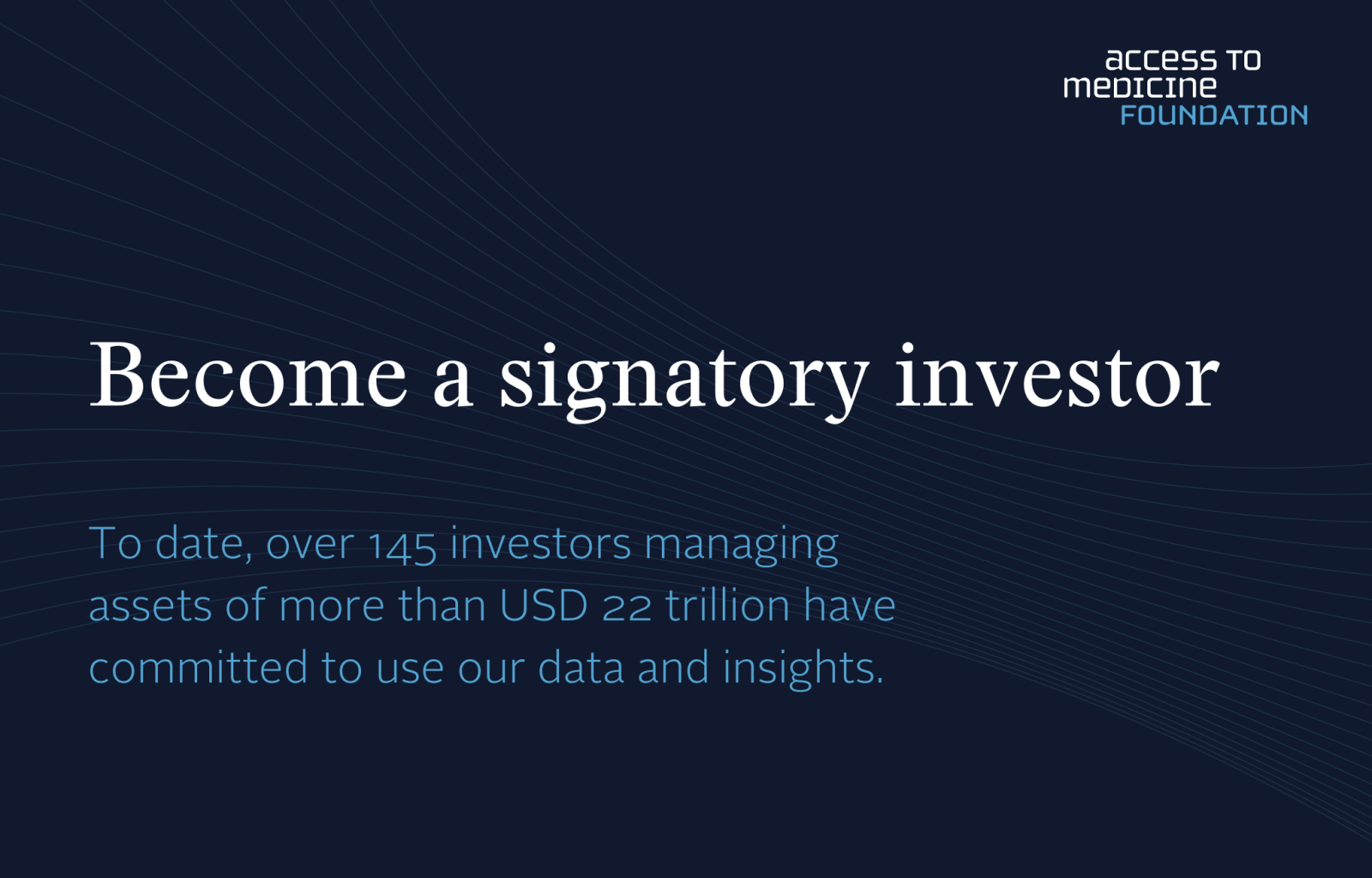 This unique opportunity allows investors to collectively drive pharma companies toward the achievement of the UN’s Sustainable Development Goal 3: to ensure healthy lives and promote well-being for all at all ages. This long-term investor-led engagement uses the Access to Medicine Index to drive and track pharmaceutical company progress and impact on increased access to medicine in LMICs. To date, over 145 investors managing assets of more than USD 22 trillion have committed to use our data and insights. Read our investor statement here.