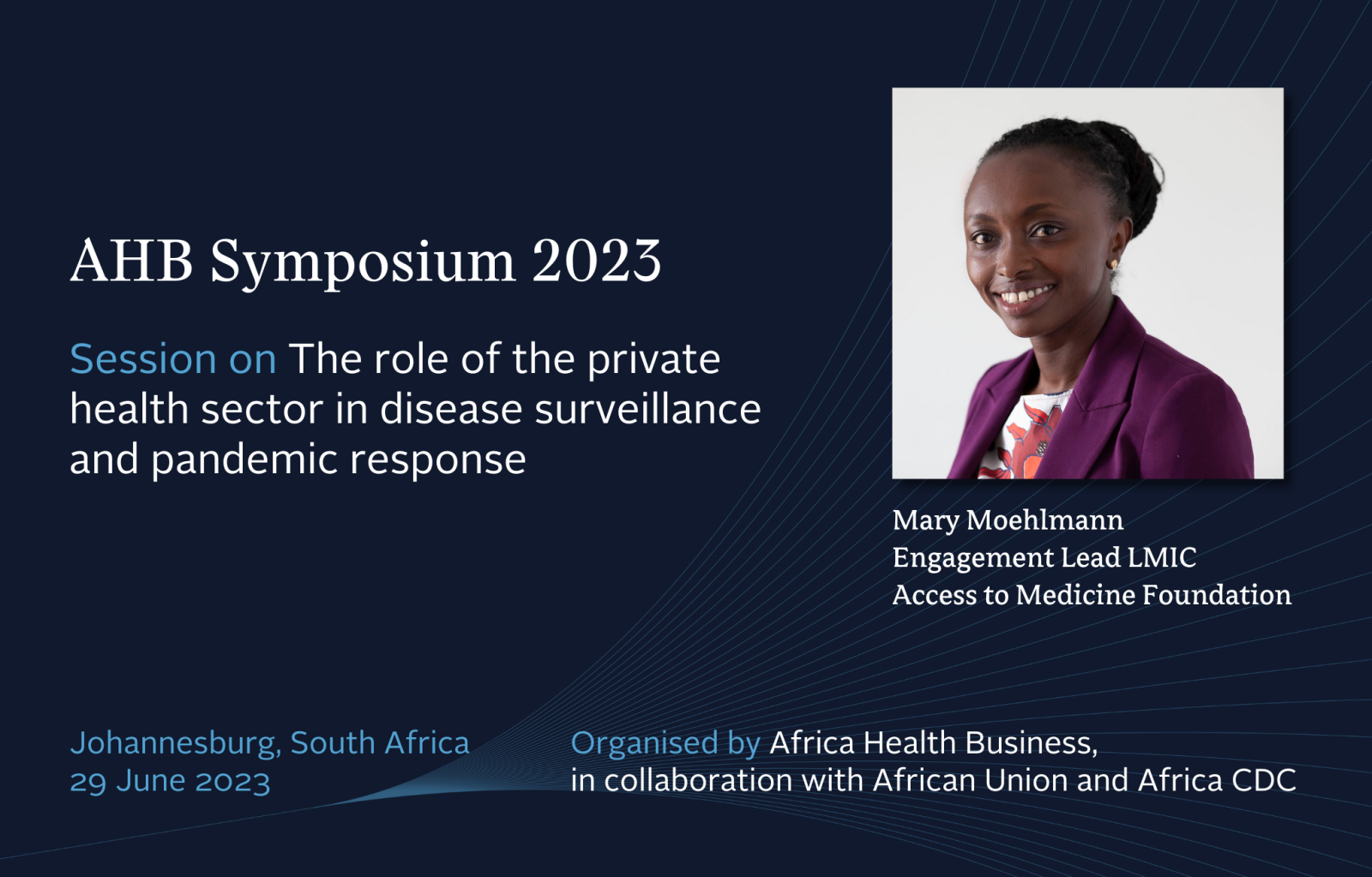 Mary Wambui Moehlmann will be attending the AHB Symposium in South Africa in her capacity as the Access to Medicine Foundation's Engagement Lead for low-and middle-income countries (LMICs). She has been invited to share her insights on "The role of the private health sector in disease surveillance and pandemic response".