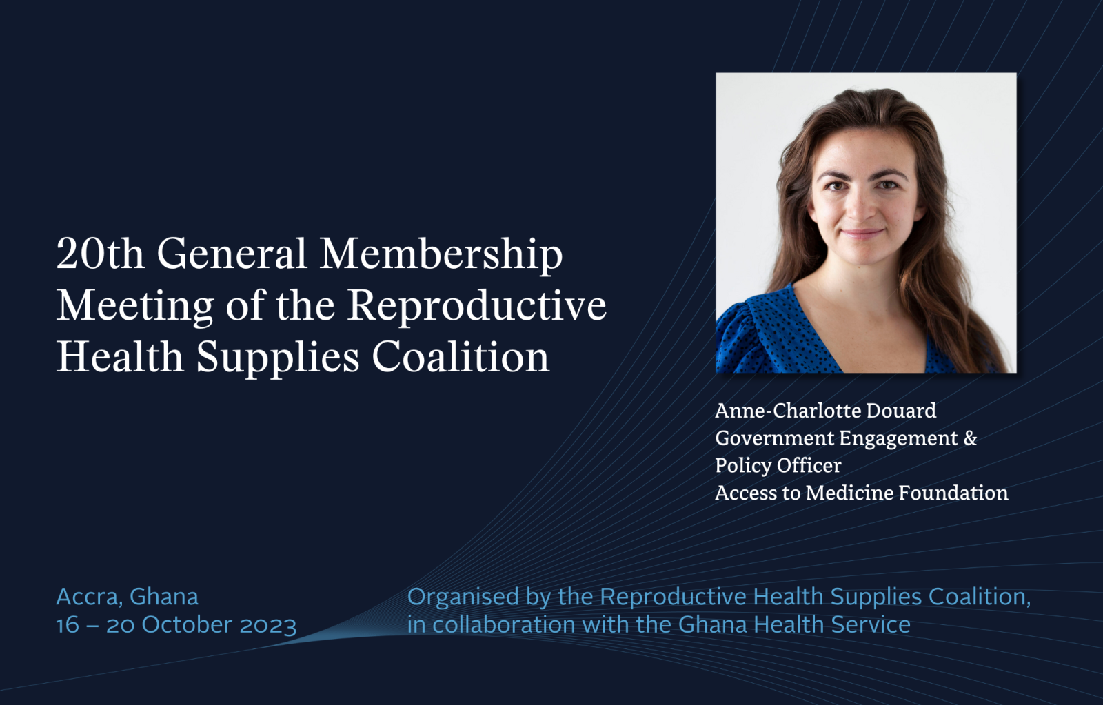 The Reproductive Health Supplies Coalition General Members’ Meeting returns for its 20th edition, which will be held in Accra, Ghana in October 2023. Anne-Charolotte Douard, Engagement Officer at the Access to Medicine Foundation, has been invited to speak at this event, which will be attended by global health stakeholders – including governments, NGOs, funders, and companies – under the theme of resilience in the face of COVID-19's impact on access to reproductive health supplies. Â