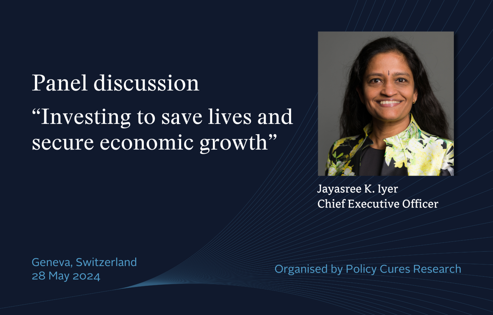 To mark the launch of its new report on funding for R&D, Policy Cures Research is hosting a panel discussion alongside the 2024 World Health Assembly (WHA), which takes place between 27 May and 1 June in Geneva, Switzerland. During her attendance at WHA, Jayasree will moderate the panel at the Policy Cures Research launch event, titled “Investing to save lives and secure economic growth”.