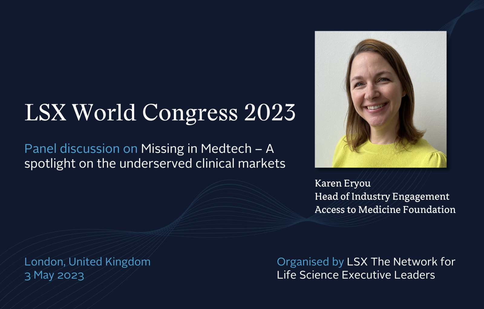 As part of this year’s Congress, Karen Eryou, Head of Industry Engagement at the Foundation, is a key speaker on a panel titled “Missing in Medtech – A spotlight on the underserved clinical markets”, which will focus on innovation in areas of unmet clinical need. Drawing on the Foundation’s work, including the 2022 Access to Medicine Index, Karen will engage with her fellow panelists on how to address access to healthcare in low- and middle-income countries.
