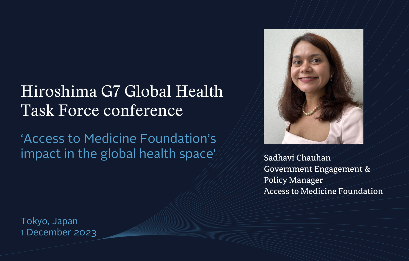 Sadhavi has been invited to attend and speak at the culmination of the initiative at an international conference in Tokyo, Japan on 1 December 2023. Representing the Access to Medicine Foundation, Sadhavi will engage fellow attendees on the Foundation’s work, sharing our impact in the global health space, as well as providing input for the G7 Health Initiatives.