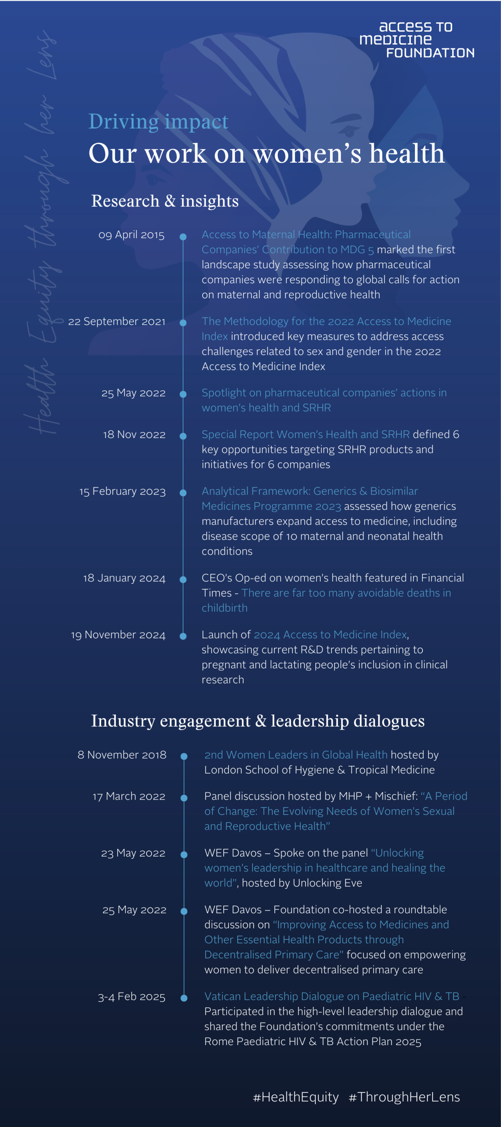 At the Access to Medicine Foundation, women’s health has been a core focus for over a decade. Through the Access to Medicine Index, we’ve tracked pharmaceutical company actions on sexual and reproductive health and rights (SRHR), identified gaps, and driven accountability. Our research has shaped industry commitments, influenced policies, and spotlighted key opportunities to expand access to life-saving medicines. We are deeply passionate about advancing women’s health, actively participating in global dialogues, high-level panels, and strategic discussions to push for stronger commitments from pharmaceutical companies, policymakers, and investors.
