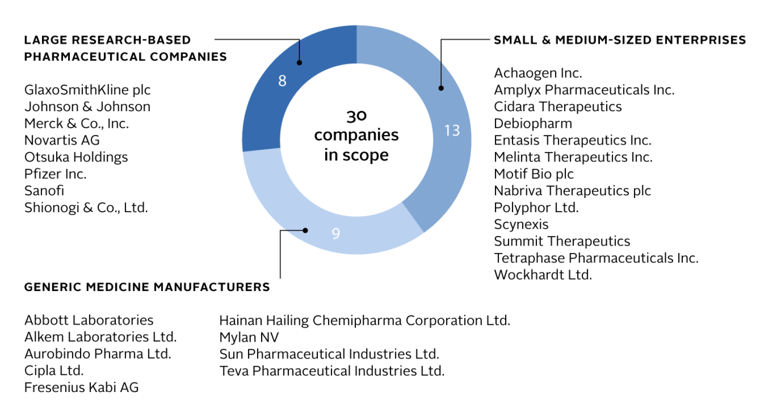 The Antimicrobial Resistance Benchmark is an independent report that tracks how key players in the pharmaceutical industry are responding to AMR. To help bring AMR under control, the role for pharmaceutical companies is clear: to develop new medicines to replace ones that no longer work, make them available and accessible to those who need them, and find new ways to ensure antibiotics are produced and promoted responsibly. But there are few incentives for pharmaceutical companies to commit to anti-infectives markets.