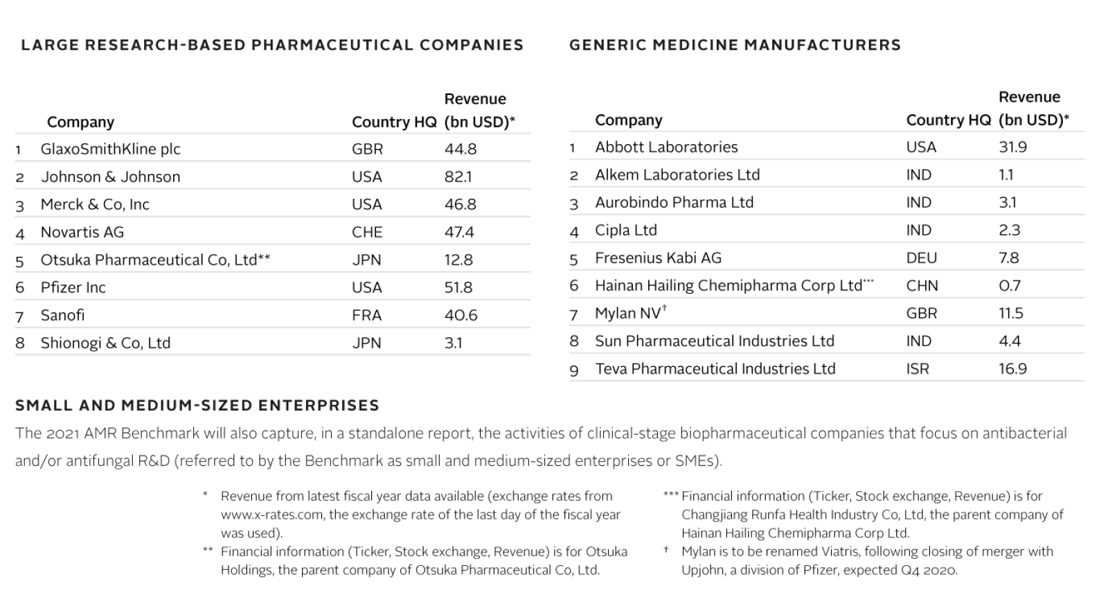 The AMR Benchmark tracks companies with a major stake in this space, and which are actively developing and/or supplying antibiotics and antifungal medicines.