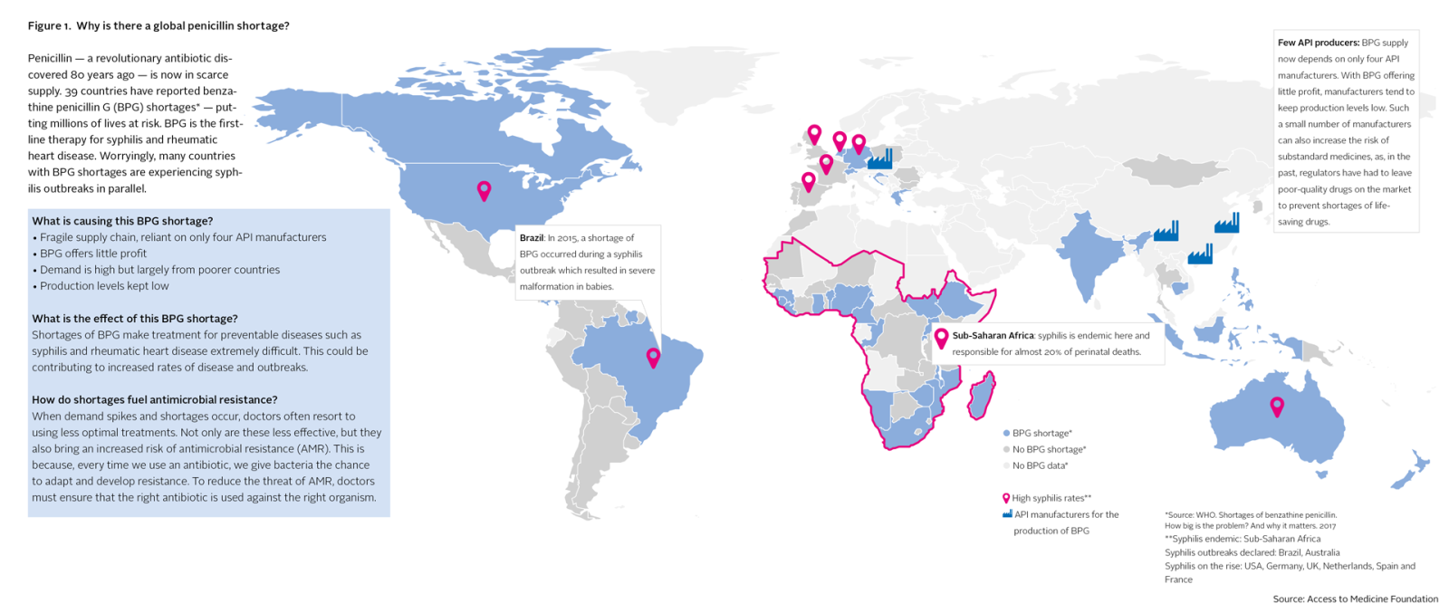Between 2001 and 2013, 148 national antibiotic shortages occurred in the United States alone. In 2010, 15 countries reported national shortages of injectable streptomycin, jeopardising the treatment of tuberculosis patients. An ongoing penicillin shortage is currently affecting at least 39 countries, now including Brazil, Germany, the Netherlands, the US and India. In Brazil, this shortage coincided with a syphilis outbreak that, as a result, could not be brought under control. Between 2012 and 2015, the number of babies born in Brazil with congenital syphilis has more than doubled.