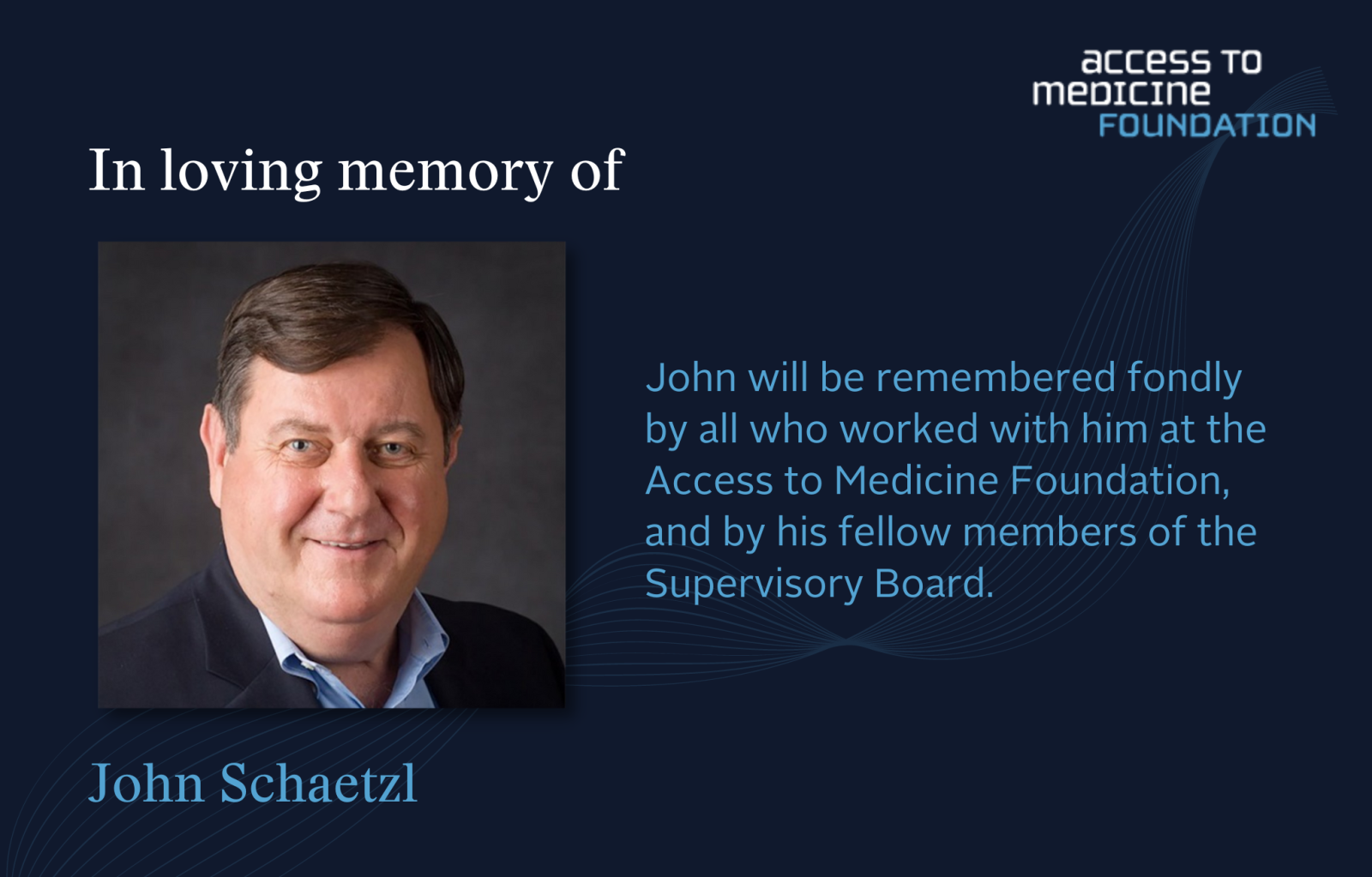 John will be remembered fondly by all who worked with him at the Access to Medicine Foundation, and by his fellow members of the Supervisory Board. Our thoughts and sympathies are with his friends and family.Â