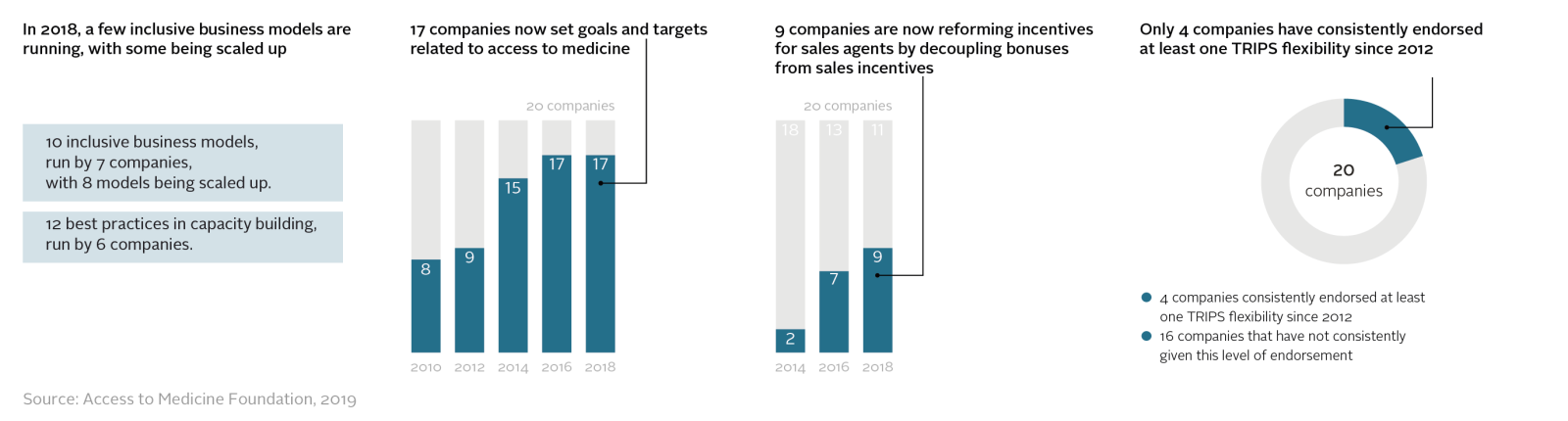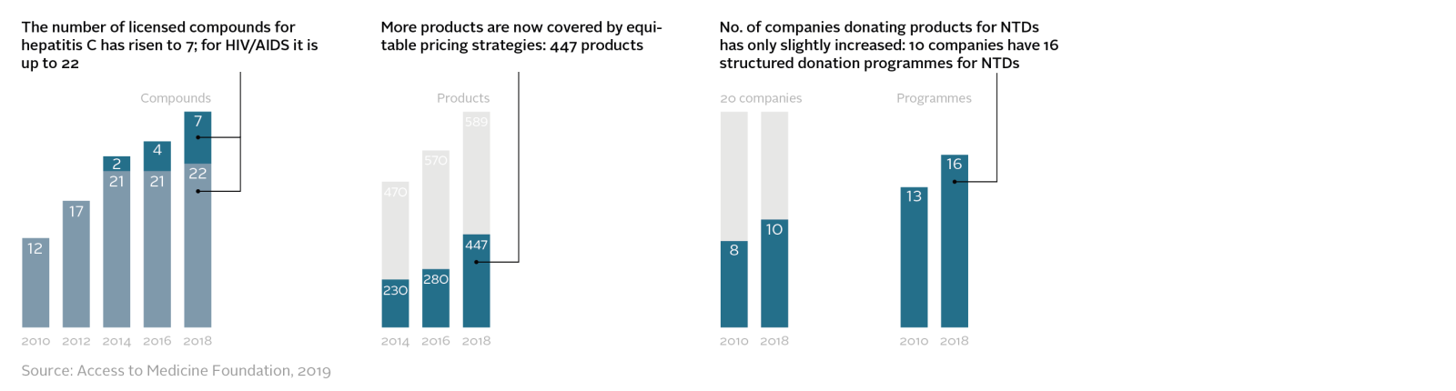 The 10-year analysis finds clear evidence of progress, most notably in R&D, and in how companies approach access. A few companies are carrying the greater part of the load. Overall, companies’ activity concentrates on a few diseases and countries.