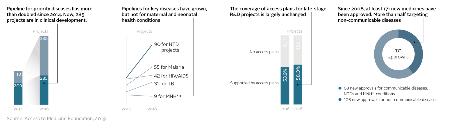 R&D pipelines have grown markedly, due to an effective recipe for engaging pharmaceutical companies in specific R&D challenges. The R&D pipeline has more than doubled since 2014 for a set of 47 high-burden and priority diseases, including HIV/AIDS, malaria and tuberculosis. Plus, five companies now systematically plan, as part of the R&D process, to address access to successful projects. In general, R&D activity focuses on commercial opportunities; more medicines for profitable non-communicable diseases were developed than medicines for diseases of poverty between 2008 and 2018 (103 new medicines for the 47 diseases in scope compared to 68).