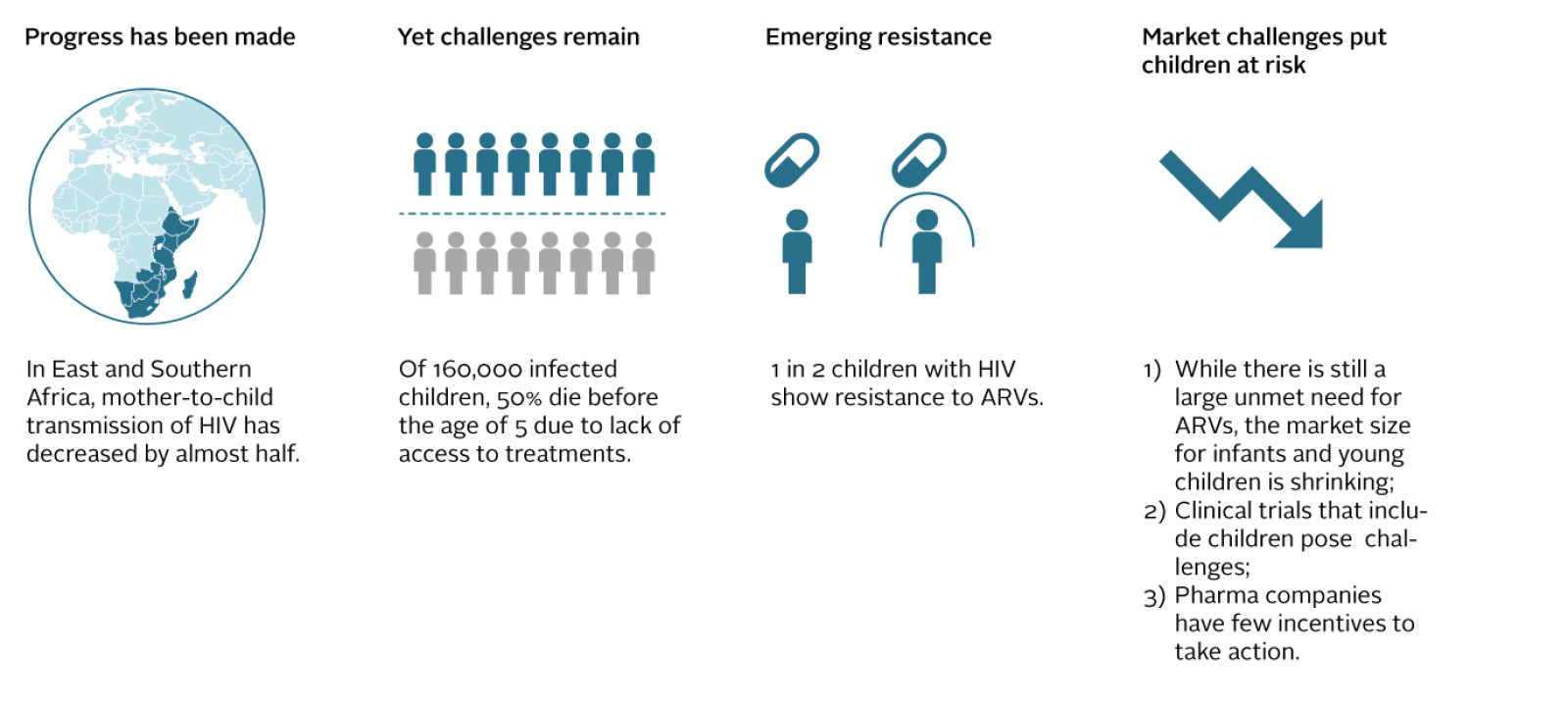 The article on HIV covers how the number of new paediatric HIV infections has decreased significantly in recent years. While this is an extremely positive trend, it also means that the market for child-friendly ARVs is shrinking, making it less attractive for pharmaceutical companies to invest in developing new ones. With one in two newly diagnosed children showing resistance to commonly used ARVs, new treatments that are child-friendly are needed to replace those that are no longer effective.