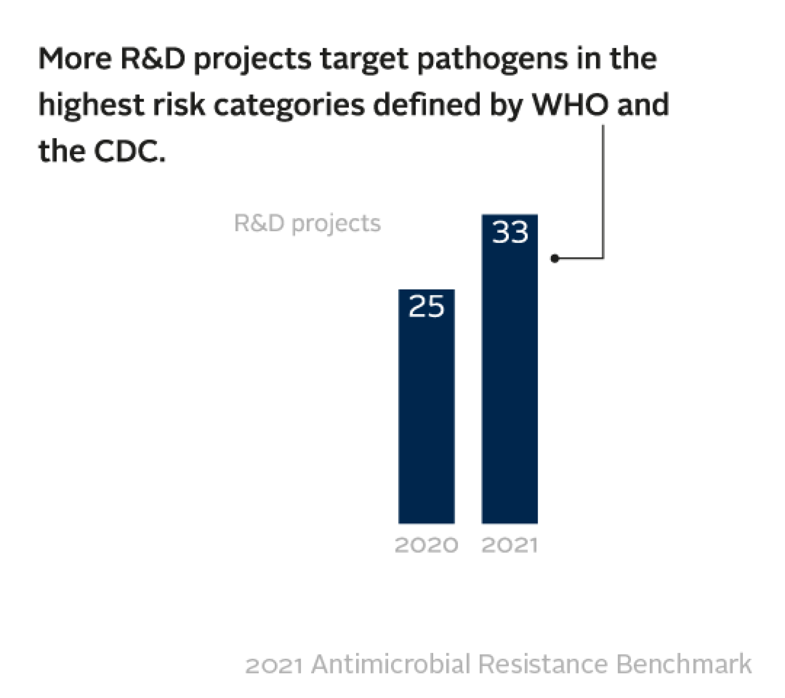 Among the eight large research-based pharma companies evaluated for the R&D activities, the Benchmark identified 92 projects that target infections caused by bacteria and fungi posing the highest risk of drug resistance. This is a slight increase on 2020, when the same eight companies were developing 77 projects. Nevertheless, the pipeline of replacement antibiotics remains small.