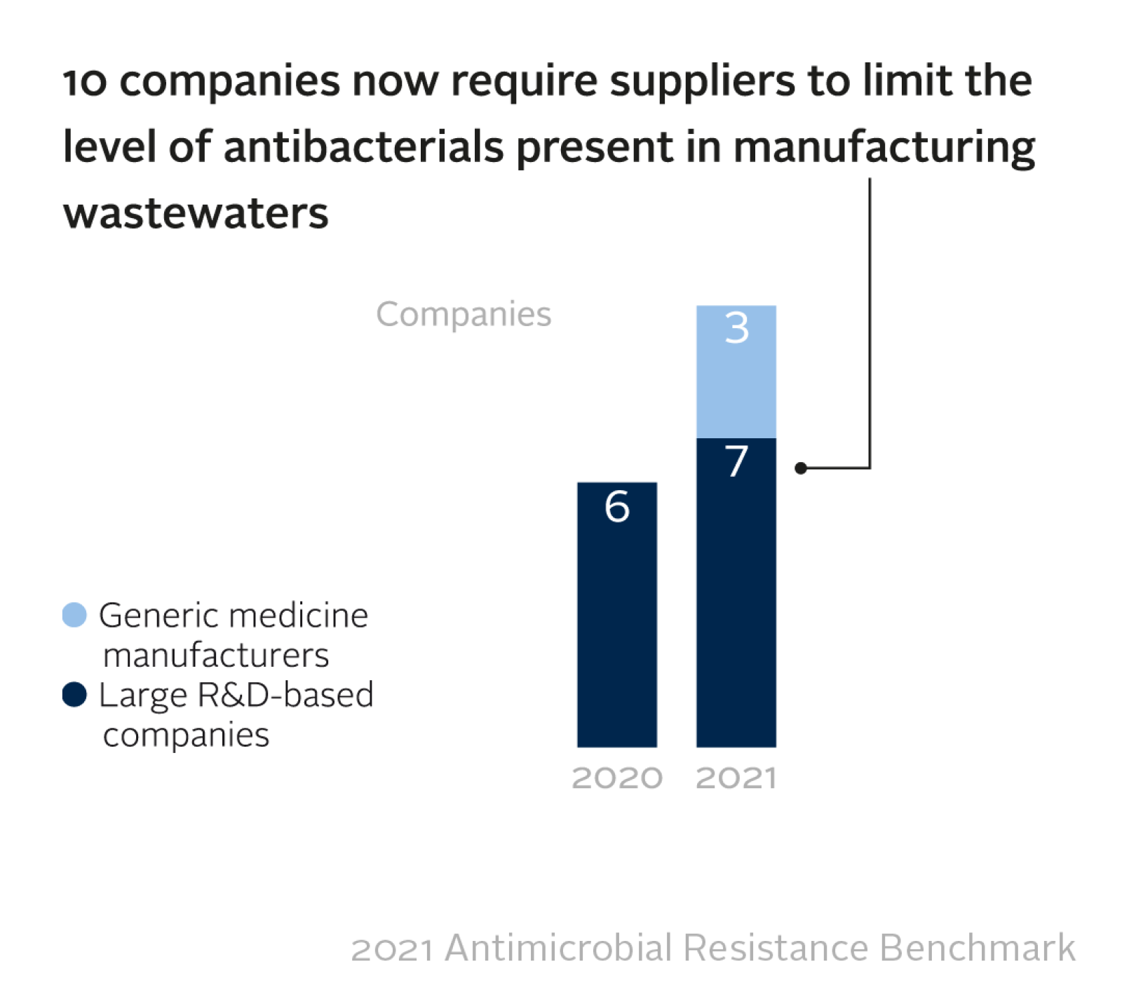 Stewardship practices, which focus on ensuring antimicrobials are used responsibly, have been expanded by almost all companies evaluated. Notably, in 2021, three more generic medicine manufacturers took action to combat the overselling of these medicines to healthcare professionals: Abbott, Aurobindo and Viatris. In 2020, the Benchmark also reported an increase in the number of pharma companies that had stopped the use of sales agents altogether, or which decoupled agents’ bonuses from sales volume.