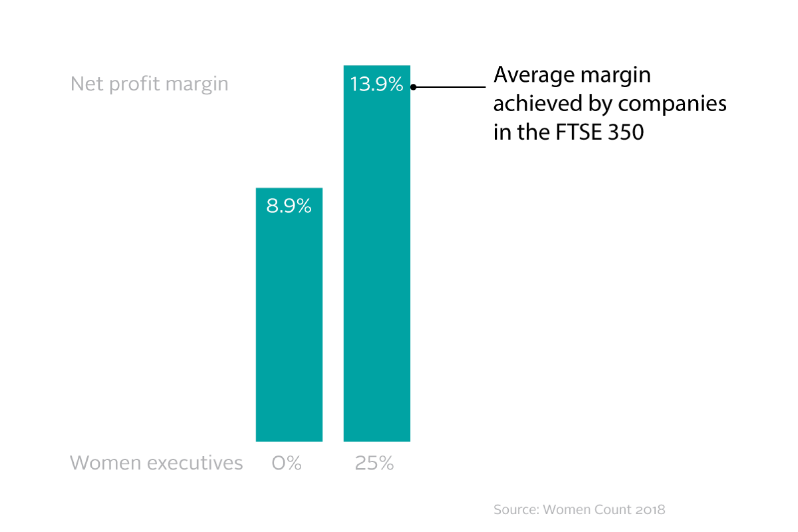 The financial argument for gender equity is strong. Companies in the UK’s FTSE 350 index with no women on their executive committee achieved an average 8.9% net profit margin, while those with at least 25% women executives averaged 13.9%, according to a 2018 report.
